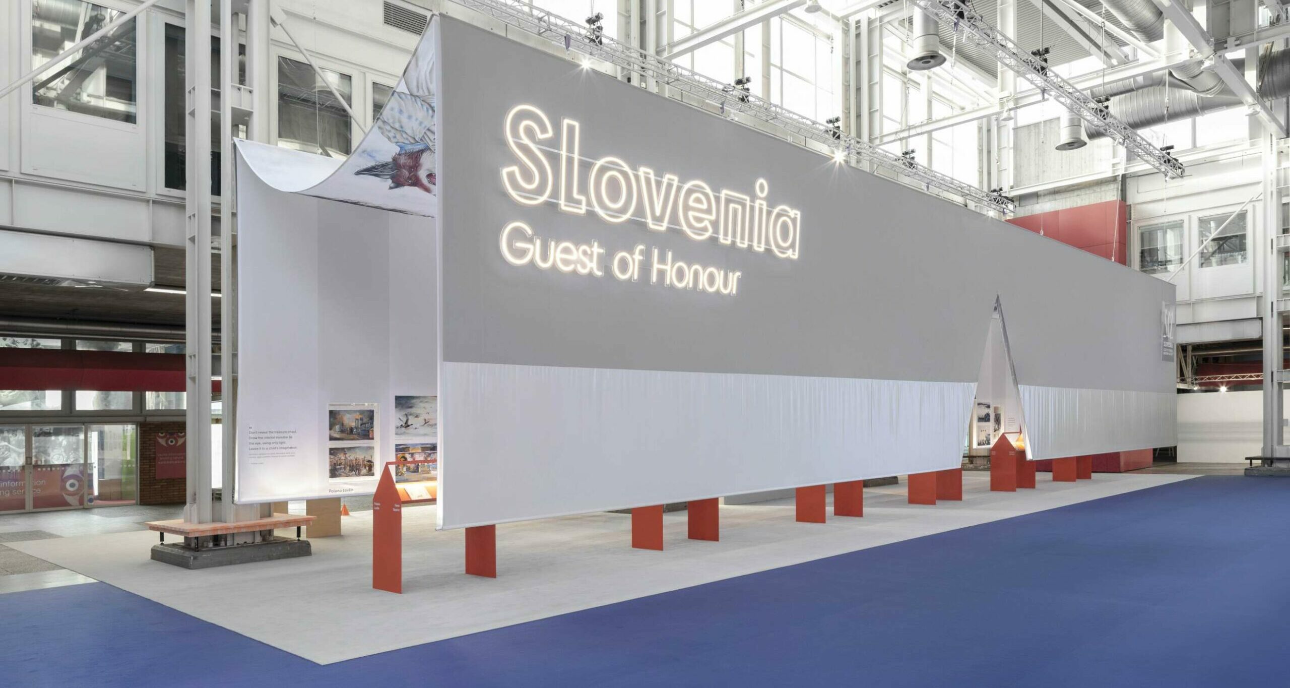 Slovenia, Guest of Honour pavilion for Bologna Children’s Book Fair was designed by Sara&Sara. Part of the exhibition space was inspired by the design of a church nave. It was executed in the form of a baldachin, showcasing Slovenian illustrators with a collage of illustrations and original illustrations. The other part of the exhibition was designed as a serene space for reading picture books and for interactions between illustrators and publishers.